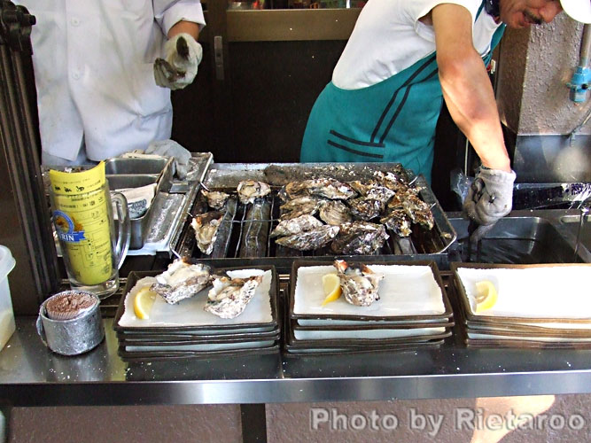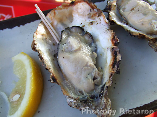 生ガキが店頭で炙られてたので、再びビールとともに買いました。