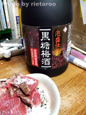 本日いただいた黒糖梅酒、梅酒なので当たり前に甘いですが、サンゴ塩をちょっと肉でくるんでもちょもちょ食べてコレを飲むと、うあーーーシアワセーーー♪と叫ばずにはおられない美味さです。