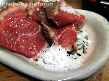 実はいつもはこの塩だけでイケるんですが、今日は晩飯食ってないしーってことで肉も添えてみましたとゆー感じ。