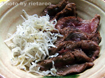 先日の残りの肉のタタキにちりめんじゃこを添えてポン酢を若干振ったモノ。