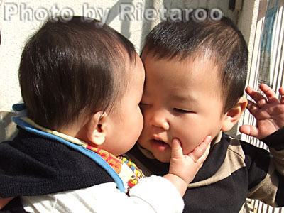 数ヶ月年上の赤子をひっつかんでちゅーしてます。どっちも男児ですよ。